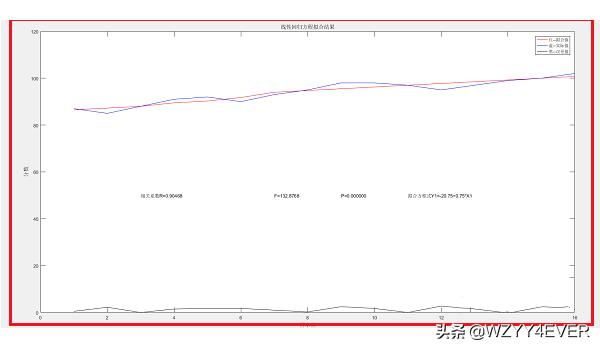 3、第三步我们也可以绘制出图形,来看一下效果,t为样本数量,y_fitting为拟合的值,通过plot(t,y_fitting,'r-',t,Y(t,:),'b-',t,abs(y_fitting-Y(t,:)),'k-');绘制出Y实际值曲线和拟合值曲线,以及残差曲线,如下图所示: