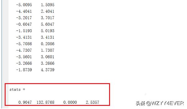 2、第二步我们可以看一下b的值,其中方程常数B0=-20.7500,变量系数B1=0.7500,置信区间是[-42.1526,0.6526]和[0.6105,0.8895],R的平方为0.9047,F为132.8768,P为0.0000,其中R的平方越接近于1代表回归模型越准确,P<0.5也代表Y=-20.7500+0.7500X方程成立,如下图所示: