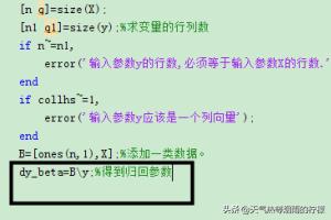 1、对于多元线性回归方程系数的求解,通常使用matlab中自带的函数regress来求。首先需要创建一个函数:function dy_beta=dyxxgxs(X,y); X,y是输入的两个参数,自变量和因变量,如图所示:
