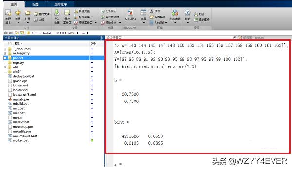 1、第一步我们打开matlab,在命令行窗口中输入“x=[143 144 145 147 148 150 153 154 155 156 157 158 159 160 161 162]';X=[ones(16,1),x];Y=[87 85 88 91 92 90 93 95 98 98 97 95 97 99 100 102]';[b,bint,r,rint,stats]=regress(Y,X)”,其中需要注意的是Y,X都是列向量,x后面加'是进行转置,将行向量转成列向量,如下图所示: