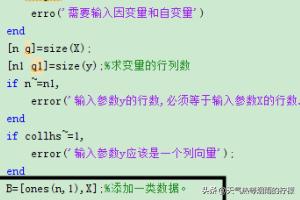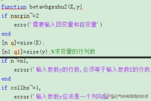 2、然后检测输入的因变量和自变量是否正确,如图所示~=是不等于的意思,如果不等于则报错。if nargin~=2 erro('需要输入因变量和自变量')end