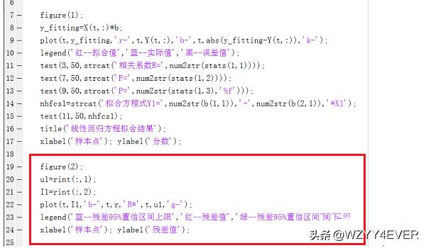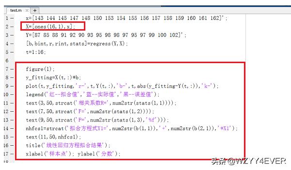 5、需要对自变量X进行添加一列1的数据,将数据写成矩阵形式,需要一列1的数据才能得到正确的结果。B=[ones(n,1),X];