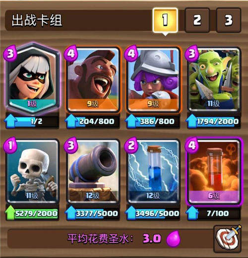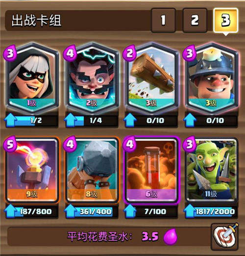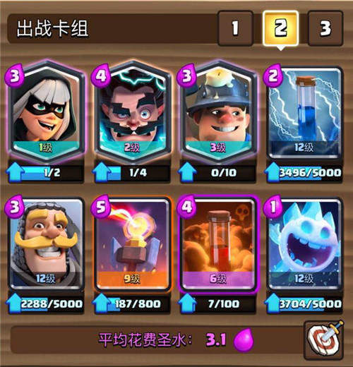 第三套卡组毒猪流是一套快速消耗类的卡组,在前期主要依靠野猪、火枪打一波快速消耗,比较惧怕人海流的野猪搭配小闪和毒药可以消耗对手的不少塔血。幻影刺客在这套卡组中可以起到分路骗解配合过牌的作用,等到双倍圣水时间可以使用野猪、火枪、刺客打一套组合攻击,一波带走对方。