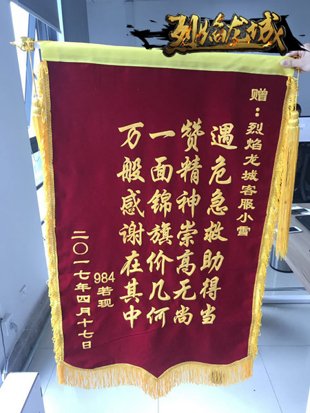 本文由欣欣吧手游资讯栏目发布,感谢您对欣欣吧的认可,以及对我们原创作品以及文章的青睐,非常欢迎各位朋友分享到个人站长或者朋友圈,但转载请说明文章出处“玩家赠锦旗表感谢 《烈焰龙城》服务赢厚爱”