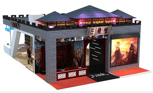 本次《三国杀》国漫展台的外形仿造古三国时期的城池而建,在入口处则是一个别出心裁的时光隧道城门。站在城门口即能仿佛置身于《三国演义》中的诸葛空城计现场,走入城门又可体会一番神奇的穿越之旅。