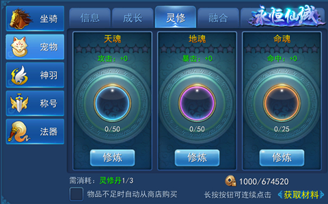 宠物灵修系统会在玩家在达到38级后自动解锁。在通过消耗足够的灵修丹猴,达到修炼天魂、地魂和命魂的目的。而天魂对应攻击,地魂对应暴击,命魂则对应命中,三魂看似分散实则相辅相成。玩家可自行选择修炼其中任一,抑或是三魂兼修,此之谓仙域正统修行之道也。