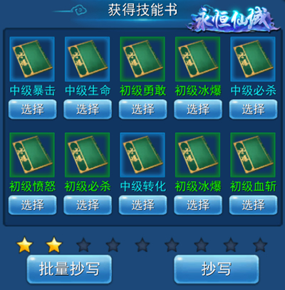 宠物学习技能需要技能书,在商城处购买的技能页便可随机获得技能书。技能书可单次抄写,也可批量抄写,每十次连续抄写获得技能都会增加幸运值。幸运值增加到一定值就会在抄写界面上增加一颗星,每加一颗星获得高等技能的概率就会增大。也就是说,幸运值越高星级就会越高,高等技能的爆率也会越高,是非酋还是欧皇就看这几下咯。