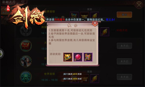 天外有天,人外有人,冰河游戏《剑绝》世界首领之外还有更强大的BOSS,那就是每日开启的跨服首领!跨服首领不仅难度比世界首领更大,而且各个服务器的小伙伴可以共同争抢。奈何跨服首领活动至少需要90级才可参与,连小编都被活动拒之门外了呢!如果各位玩家对世界首领没有兴趣了,不妨挑战一下跨服首领,感受更激烈的混战吧!