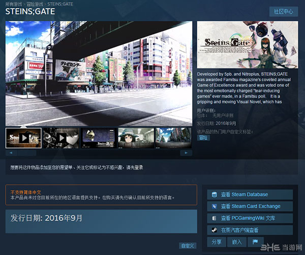 刚刚steam上出现了命运石之门(STEINS;GATE)的购买页,页面显示游戏将在2016年9月发售,steam的开发商和发行商都为MAGES.INC. 。命运石之门是5pb.与Nitro+合作企划的妄想科学ADV系列冒险游戏的第二作:假想科学ADV。